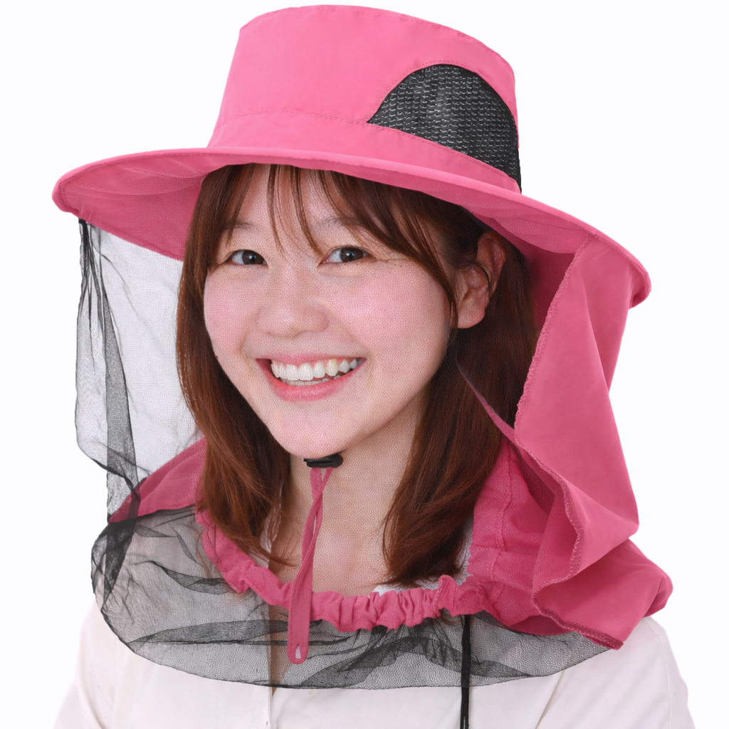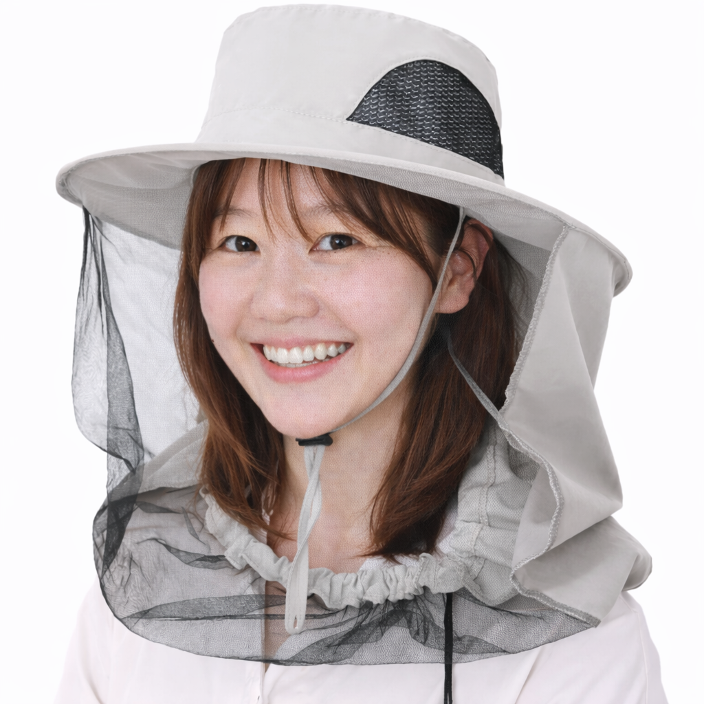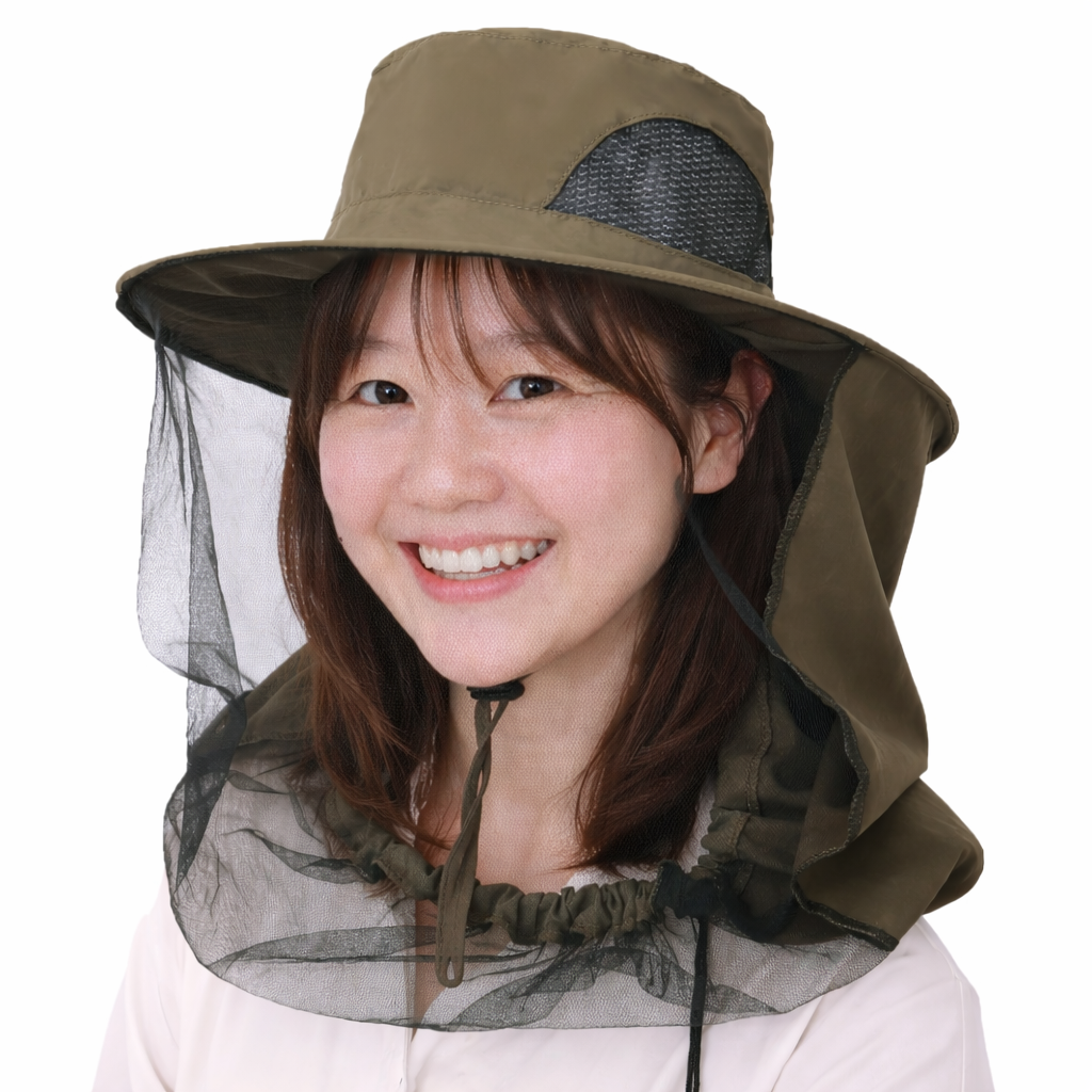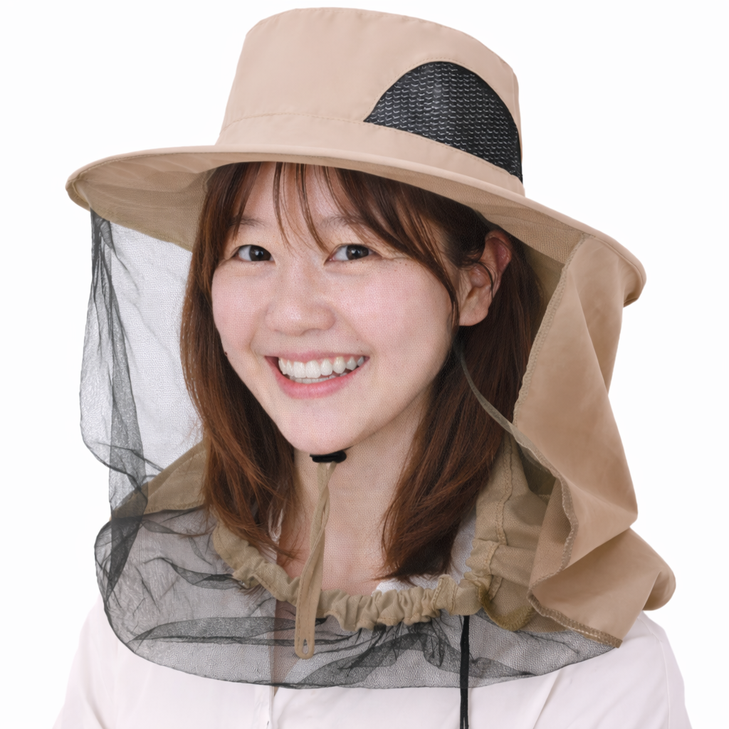 蚊、ハエ、ハチなどの害虫からお肌を守る、日除け付きの虫よけネット付き帽子です。日除けと虫除けネットの一体型タイプの帽子となります。ネットの裾部分にはドローコード付きで、風が吹いてもしっかりと害虫からガードします。